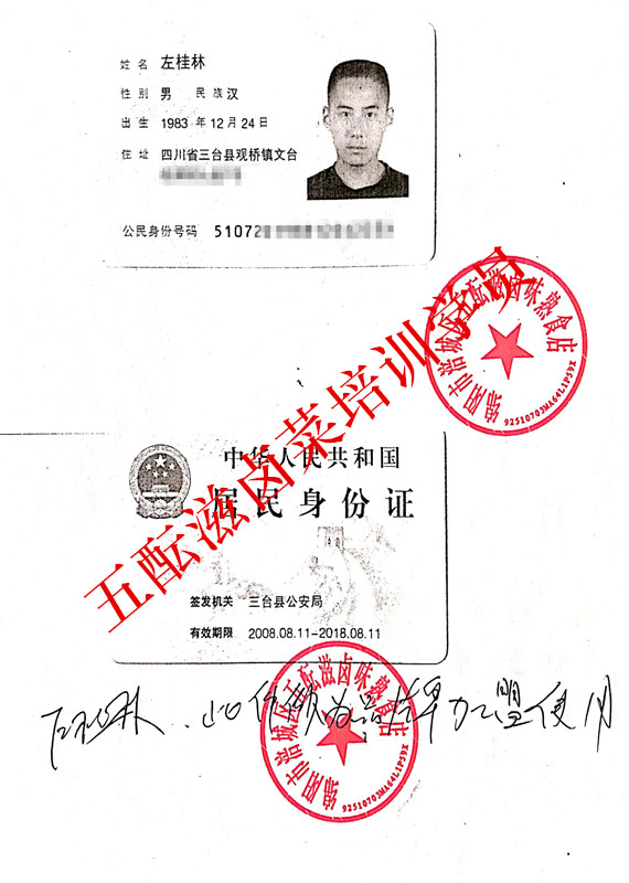 四川省绵阳市三台县左桂林先生-选择四川绵阳五酝滋川卤美食品牌学习卤味熟食技术,感谢您对五酝滋品牌的选择与信任,我们承诺:实体店模式民间传统技术申明我们不是培训班,我们是以家庭式招收学徒的方式传授卤菜技术,学徒必须做出来的味道和我们自己铺子上卖的味道一样,最后学徒做的东西是要拿到铺子上卖的。卤菜技术的核心是卤水的清水调理技术和保管,卤水好产品一定好,我们为了让每位朋友能学到好的技术。